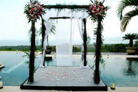 Decorated wedding ceremony area with simple standard decoration (Flower gate, White Balinese Umbrella & Flags, table as altar & fresh Balinese flower arrangement on the table)
