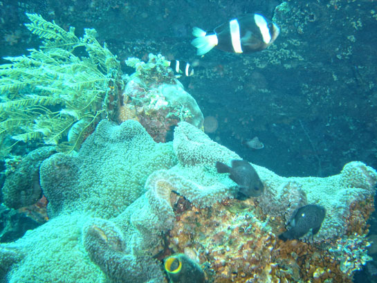 After one of our aborted attempts on the Canyon, Wally directed our jukung to the far eastern end of the island. We dropped into surging, cold water, and shivered as we descended. Visibility was restricted by the water movement to around 8 meters. And the surge was too strong to allow us to peer into the many caves - between 16 and 32 meters as well as a 10-meter-long passage between several huge boulders that appear to have fallen from the topside cliff. We spotted a tuna, a fairly big grouper and a cuttlefish after we made our way down the slope to about 25 meters. The coral cover was good, including both stony corals and soft corals, and several blunt pinnacles sheltered reef fish in shallow pockets. Fish huddled between overlapping layers of table coral, each irregular "shelf" holding several species. All this was fine, but the strong continuing surge, lack of visibility and cold water led us to surface before our air ran out.